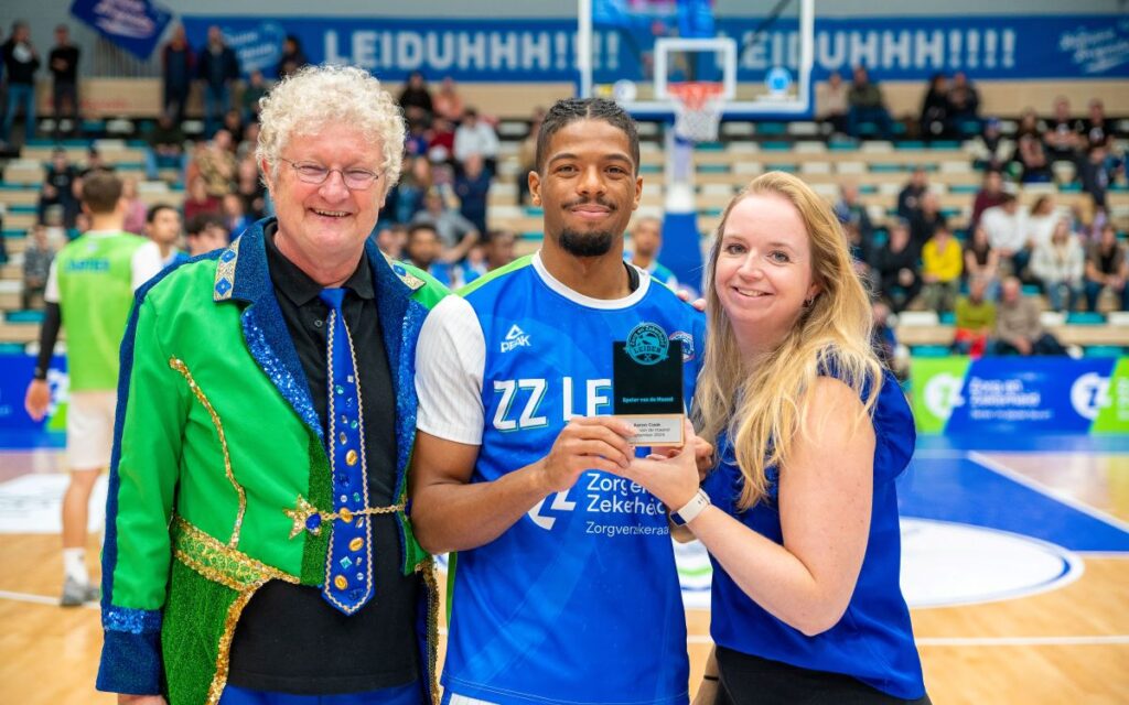 Aaron Cook is door de Leidse fanZZ gekozen als Speler van de Maand September! Hij ontving zaterdag de bijbehorende trofee, gemaakt door awardguru.nl, uit handen van Nienke de Ligny van De Blauwe Brigade. Dat gebeurde voorafgaand aan de game tegen Okapi Aalst.